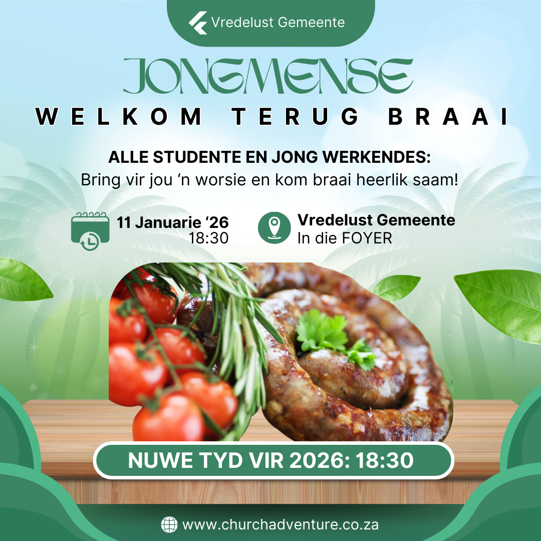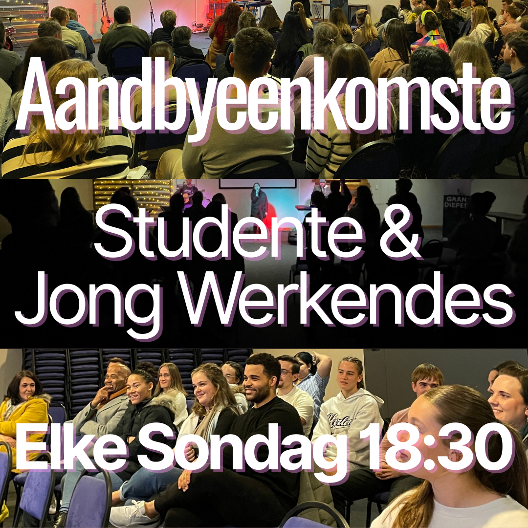 Die Sondagaand byeenkoms vir Studente en Jong werkendes vind plaas in die Vredelust Konferensielokaal.